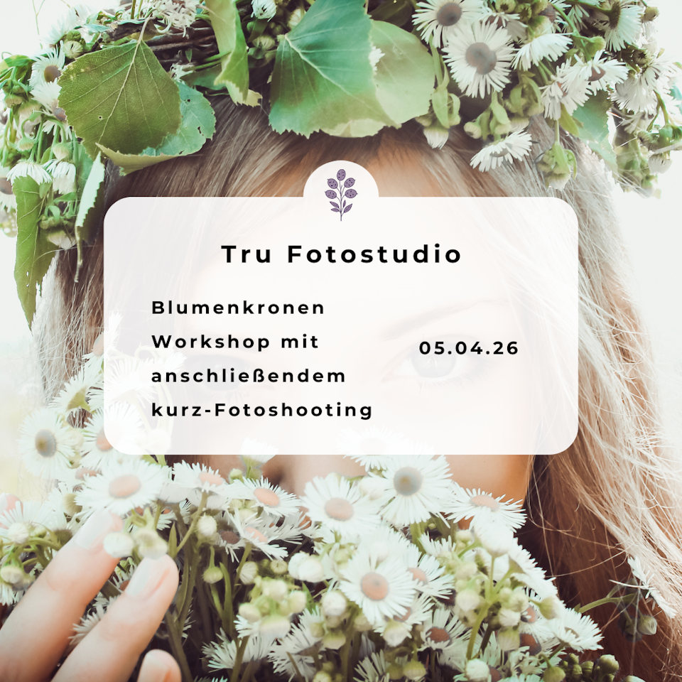 In den gemütlichen Räumen des Tru-Fotostudios gestaltest du deine eigene Blumenkrone. Dafür steht dir eine große Auswahl an wunderschönen Trockenblumen zur Verfügung. Unter fachkundiger Anleitung lernst du Schritt für Schritt die Technik, mit der deine Krone entsteht.
