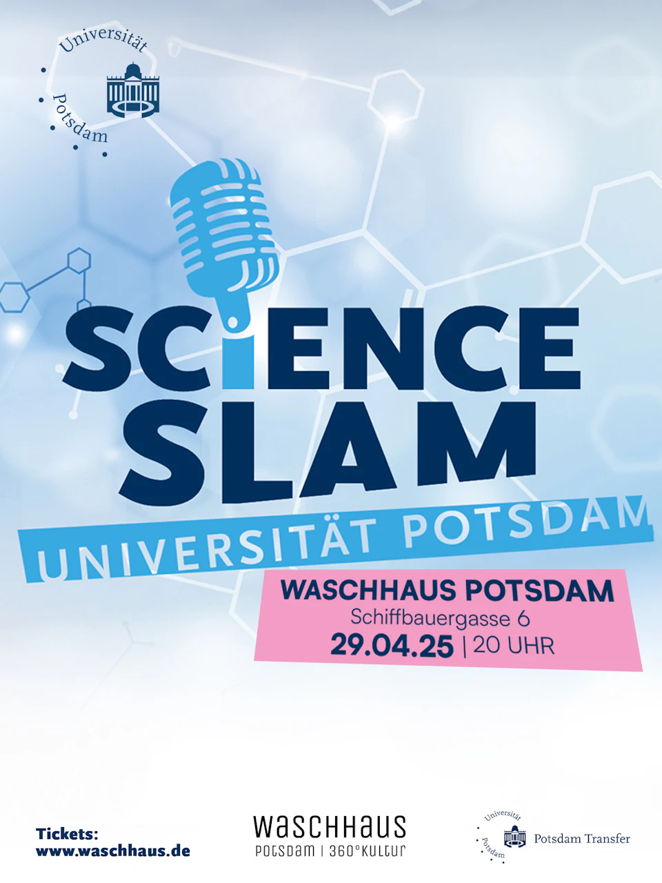 Was sind gute Trennungen? Und kann man mit ihnen die Welt verbessern? Wer Antworten darauf hören möchte, sollte am 29. April um 20 Uhr zum Science Slam der Universität Potsdam in die Waschhaus-Arena kommen. Hier gibt es harte Fakten im Zehn-Minuten-Takt! Witzig und pointiert erklären junge Forschende, woran sie gerade arbeiten. Sie wissen zum Beispiel, wie sich mithilfe von Daten Krankheiten bekämpfen lassen oder was man von Kernkraftwerken über den Schutz der Demokratie lernen kann. Dass Polymere viel mehr können als Plastik wird ebenso überzeugend dargelegt wie der Zusammenhang von Statistik und Zellbiologie. Achtung: Mathematik!