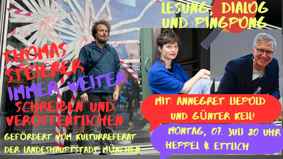 Nach dem erfreulichen und vielversprechenden Auftakt der Reihe Anfang Juni, geht es am 7. Juli weiter: Thomas Steierer, Autor und Kabarettist, der an seinem ersten Roman arbeitet, begrüßt im Rahmen der vom Kulturreferat der Landeshauptstadt München geforderten Veranstaltungsreihe im Heppel & Ettlich an der Münchner Freiheit auf der Bühne diesmal die Schriftstellerin und mehrfach prämierte Roman-Debütantin Annegret Liepold, und den Literaturkritiker und Moderator Günter Keil, der auf diversen Kanälen seine Begeisterung für Literatur einer immer weiter wachsenden Zahl an Leserinnen und Lesern vermittelt.