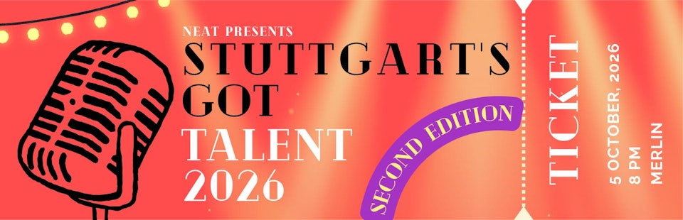 Back by popular demand, Stuttgart’s Got Talent! The smash hit from 2025 is back with more talent than ever! Join us again for an unforgettable evening with all new acts. They’ll strut their stuff, they’ll play their tunes, they’ll wow you with their moves! And who will be the judges of this review? That would be You! So get yourselves to Merlin on October 5th for NEAT’s Second Edition of Stuttgart’s Got Talent and enjoy more dancing, more singing, more comedy, and maybe a little drama - and some surprises from your favorite hosts, Claire and Jasmine!