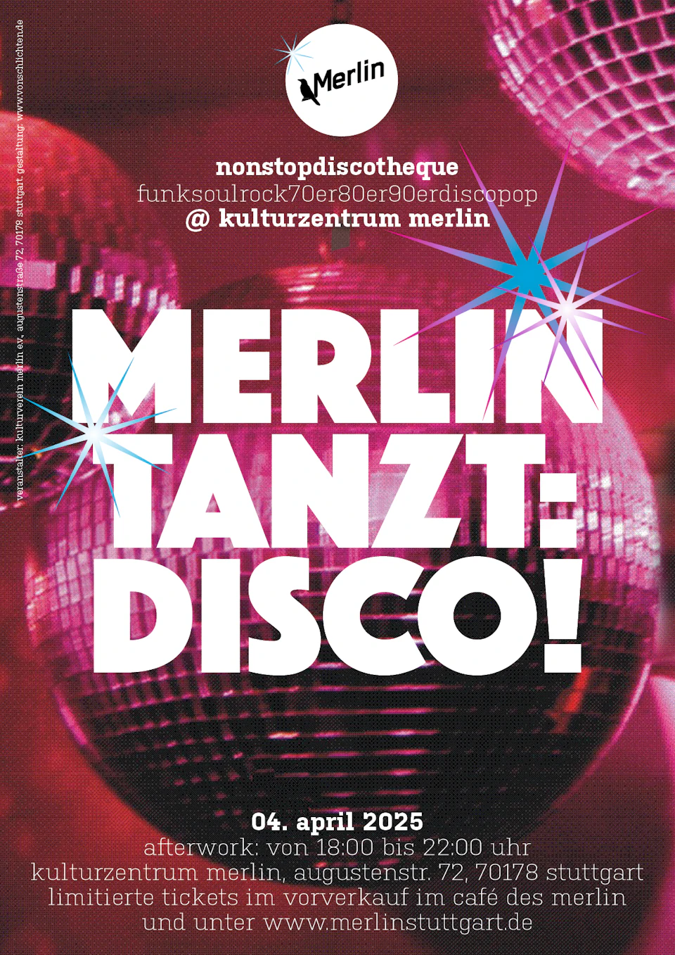 Wir bringen die Discokugel in Rotation und unsere Gäste gleich mit: afterwork-Tanzparty im Merlin! Danach entweder ins Stuttgarter Nachtleben stürzen oder im Café des Merlin noch einen entspannten chillout-dance-drink geniessen.