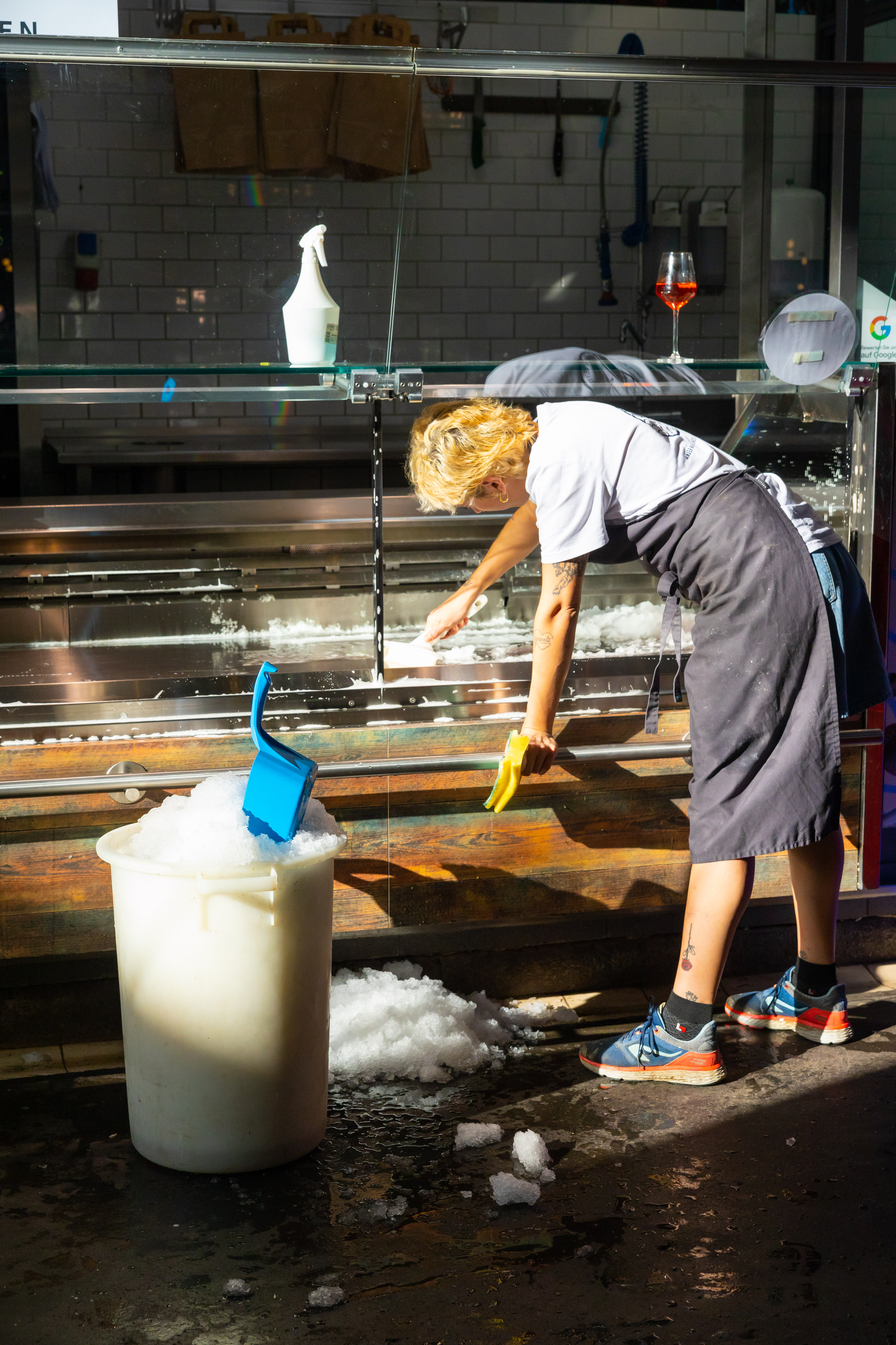 Die Fotografin Carla Ulrich hat über Monate hinweg dokumentiert, was hinter den Ständen der Markthalle Neun geschieht. Ihre Bilder erzählen von schnellen Händen, konzentrierten Blicken, vom Handwerk und der Energie, die es braucht, um diesen Ort lebendig zu halten.