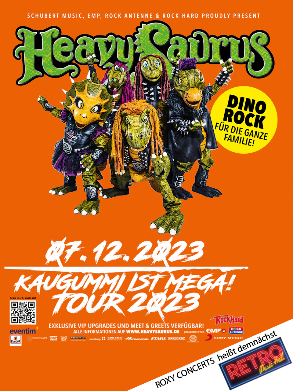 Vier Dinosaurier und ein Drache, die Rockmusik spielen für die ganze Familie, mit kindgerechten Texten und einer tollen Show für die kleinen größten Fans. Das sind HEAVYSAURUS! 2023 geht die heißeste Band für Kinder auf große „Kaugummi ist mega!“-Tour.
