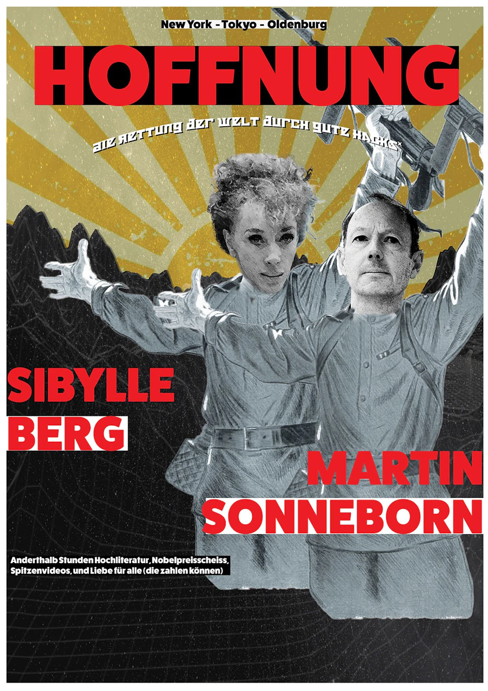 Die Rettung der Welt durch gute Hacks Die Autorin Sibylle Berg trifft auf den EU- Politiker und Satiriker Martin Sonneborn: anderthalb Stunden Hochliteratur, Nobelpreisscheiss, Spitzenvideos und Liebe für alle (die zahlen können).