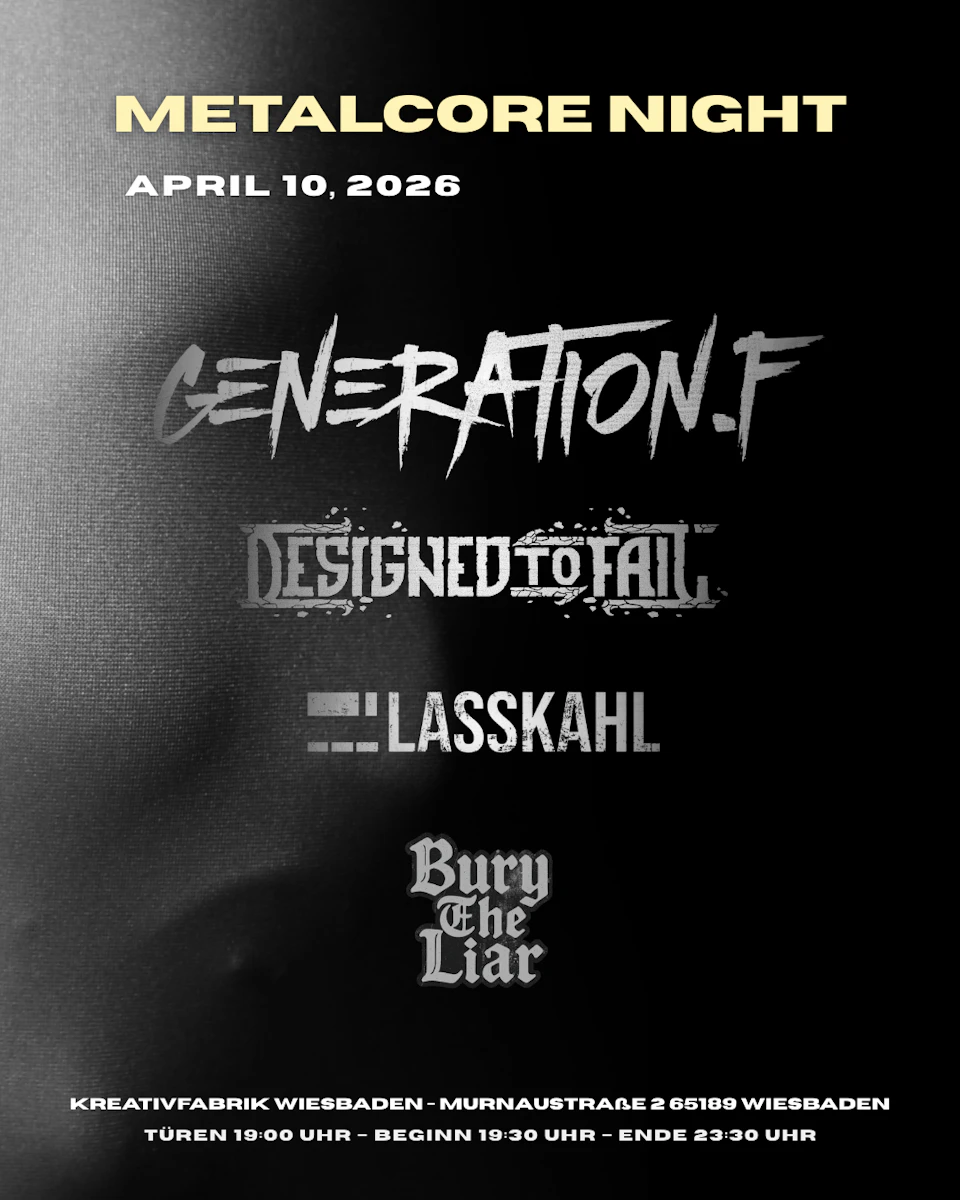 Metalcore-Fans aufgepasst, DESIGNED TO FAIL, LOSING MY GRIP, GENERATION F und LASSKAHL präsentieren das perfekte Abend-Programm für alle Breakdown-Enthusiasten und blegh-Begeisterten.