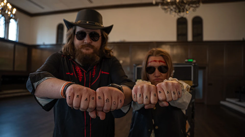 The Tragic Radicals are a spirited two-piece instrumental band boasting the elements of progressive rock, surf, and grunge. Categorized in a fanciful genre dubbed 'Choose Your Own Adventure,' the band's song crafting has proven to trigger a diverse audience, and their ability to unapologetically cram endless hard and soft musical configurations and time signatures into a two and a half minute song is exceptionally unconventional. For those who have had the opportunity to experience them live agree that it's hard to conceive that the amount of sound radiating from the stage comes from just two people.